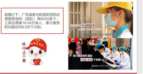 团课后半部分,马骁老师分享了多支广东青年志愿者队伍事迹,他们在平凡的岗位中,做出了自己不平凡的贡献。为医学隔离观察点的留观人员准备热腾腾的早餐,挨家挨户走访登记协助排查工作,张罗“临时理发店”免费为大家解决“头等大事”……广东志愿者在疫情之下做出了突出贡献。同样地,广东外语外贸大学多语言志愿服务队也积极发挥学校外语专业的优势,围绕国家和省委省政府的重大决策部署提供高水准的专业志愿服务,荣获“广东青年五四奖章”。