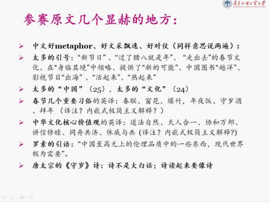 负责汉译英部分的胡正茂教授同样从原文出发,介绍了它的写作背景,指出译文存在的标题“不入眼”、缺乏检查审阅、表达不地道等问题和错误并提出修改意见。他特别强调译员要具有查询、查证、搜索的能力,学会利用谷歌、语料库等渠道查询原文出处。