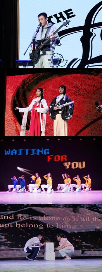 有趣的中场游戏结束后,霏阳吉他协会用《Memories》和《我的天空》两首歌曲点燃了现场观众的热情,尽显青春活力。院模特队和华笙汉服社、院歌队联手带来“特殊版广外维密秀”——《汉乐之心》,用传统文化为T台秀作出全新的解释。动人的歌声与精彩的T台走秀相得益彰,古色古香的汉服也晚会增添了一缕淡淡的清雅之气。随后,院舞队带来的《Colorful Bomb》将时代最潮流、最律动、最高能的舞蹈元素与流行音乐进行了完美融合,全场气氛高涨。1901班与1910班联合带来了歌舞情景剧《New Year Eve》,呼吁我们要心怀仁慈、乐于助人。