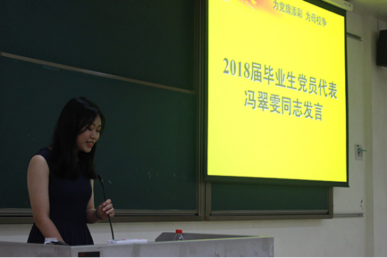 冯翠雯同志代表2018届毕业生党员发言。她向母校的培养表达了感谢,并号召同学们在离开大学后依然能保持共产党员的初心,继续以一名优秀党员的标准严格要求自己,自始至终,心中有党,时刻铭记自己共产党员的身份。