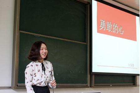 首先进行分享的是文化与传播1508班的何佩珊。她围绕“勇敢的心”这一主题分享了其在大学三年中印象深刻的经历,并向在场观众提出了专业学习的个人建议。在大一期间,何佩珊确定个人目标、抓住契机,参加学术竞赛并获得多个奖项。大二时,她坚持晨读,并依然保持着其参加语音语调大赛时每天练习配音的习惯。她以自己参加演讲大赛为例,说明日常读书积累好词佳句对于专业技能提升的极大帮助,建议同学们坚持每天读书。大三时,何佩珊前往美国加州大学伯克利分校交换学习,现场她也讲述了在美国的求学经历,阐述了个人对人生和发展的思考。国外丰富的经历,让她更加增进了文化自信和作为青年学生的使命和担当。最后,她用“无问东西”与在座观众共勉。