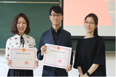 高级翻译1402班陈坤昊、语言学1411班曾慧琪、文化与传播1508班何佩珊、1605班骆乐安作为主讲嘉宾出席本次分享会。本次活动首先进行的是国家奖学金的颁奖仪式,王晞分别为文化与传播1508班何佩珊和1605班的骆乐安颁发证书。