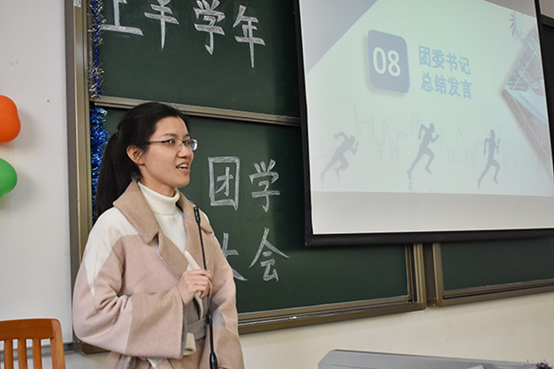 随后,团委书记王晞进行总结发言。她首先向团学的全体成员表示感谢,并对上学期各部门在各项活动中的积极付出和成果表示赞同和肯定。同时她也希望在未来的工作中,团学干部干事能够总结工作经验、更好地提高工作效率,保持向上的工作作风,树立团学工作的新风貌、新形象。王老师认为,在工作中,部门之间能够相互配合相互理解,这样才能共同进步;在部门内部,部长及干事都能够明确自己的定位,不光要多做事,更要做实事,争取在巩固好上学期工作、活动的基础上,争取更大程度上发挥团学服务学院师生的作用、争取更大的工作成果。
