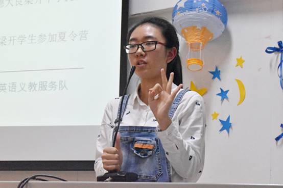 大会第二项佛山顺德梁开中学支教服务队(Firefly7.0)的队长李梓蓉进行队伍展示。李梓蓉具体介绍了她所在的队伍的组成和各组的职能,接着回忆了“三下乡”时和孩子们的感人故事。李梓蓉说,自己在这次三下乡中最大的收获就是结识了这群可爱的孩子,希望这支队伍能够一直传承下去。最后,她用当时的闭幕视频作为展示的收尾。