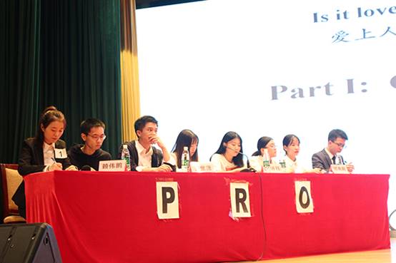 比赛以辩论双方的开篇陈词开始。正反方一辩就爱情的定义针锋相对,正方一辩赖伟鹏围绕“爱情”提出每个人对于爱情的看法不一,因此任何形式的爱情都不应该被抗拒的观点。而反方一辩丁泽颖同学认为爱情属于双方在主观上的意愿,而AI没有主观意识,因此与人类无法产生爱情上的共鸣。紧接着是双方二辩在爱情的产生上展开激烈交锋。正方二辩王紫潇认为,人有自我感受,每个人期待的爱情都是不同的,不能用伦理道德去捆绑人与人工智能的爱情。为论证此观点,她还拿生活中发生的事情与辩题进行类比。三号译员林伟钊用灵敏的反应能力,彰显了译者沉稳大气的风采。双方三辩就之前提出的问题据理力争,进行了激烈的交锋。6号译员付辉亮紧跟辩手节奏,中文翻译英文,节奏快准狠。正方四辩邓冉阳以犀利的话风,幽默而又不失干练的语言,直面对方提出的两个问题,同时指出对方存在的漏洞,令现场观众拍案叫绝。
