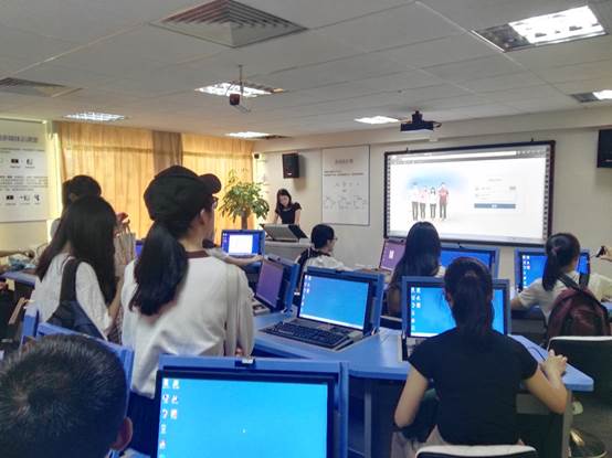 随后,蓝鸽的工作人员带领大家参观了集团的数字化多媒体实验室。在工作人员的一番演示后,学生尝试操作相关设备,感受科研与英语教学结合的魅力。他们不断摸索,操作越来越熟练。负责人详细地讲解企业技术核心,同学们听得津津有味,深深的体会到自己所学专业在社会发展中发挥着重要的作用。