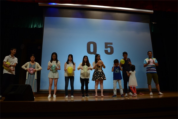 欣赏完歌舞之后,便是激动人心的抢答环节——《极限挑战》。除了原定的六位答题选手之外,贾春成辅导员、李承老师和他的两个孩子也在大家的呼声中应邀登上舞台。能说会道的主持、率性可爱的孩子、紧张刺激的小游戏都让现场的气氛愈发活跃。