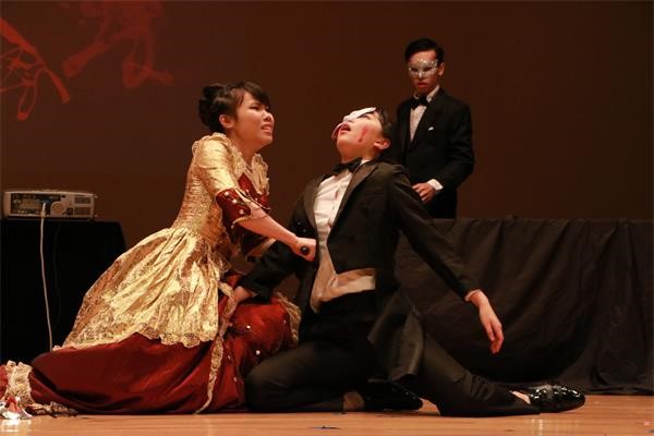 1401班《The Phantom of the Opera》一开始,演员们便以华丽的欧洲宫廷服装、紧凑的表演节奏和丰富的表情动作迅速抓住了观众的眼球,生动再现了《歌剧魅影》的原剧部分。其中最摄人心魄的,是男主角“幽灵”的朗诵者罗垚希的配音。她低沉、带有磁性的声音很好地表现了这一角色内心的仇恨与痛苦,而且,她以恰当的节奏更加丰盈了一个充满艺术柔情的残忍魔鬼在爱中饱受煎熬、痛不欲生的形象。其剧情凄美而悲壮,其与原著的爱恨情仇交错的主题可谓是一脉相承。