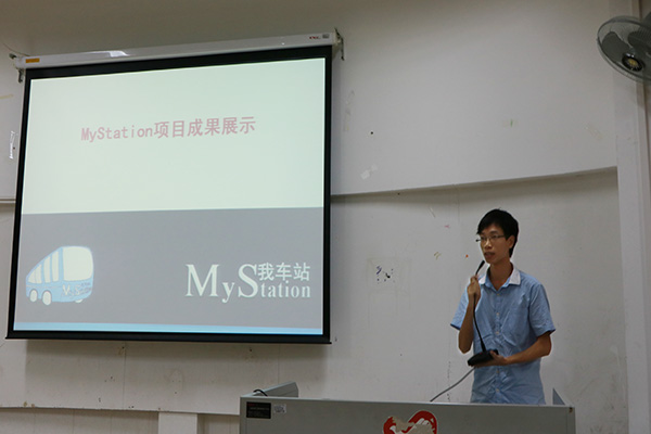 在主持人欧明欣对创新大赛进行了简单的介绍后,第六届创新大赛荣获电子设计类二等奖的团队MyStation上台领奖并接受表彰。随后,MyStation主创人员中的黄文、苏健聪以PPT的形式介绍了其作品的设计初衷和主要功能,进而分别展示了MyStation的网页端口和手机应用程序的具体使用方法。