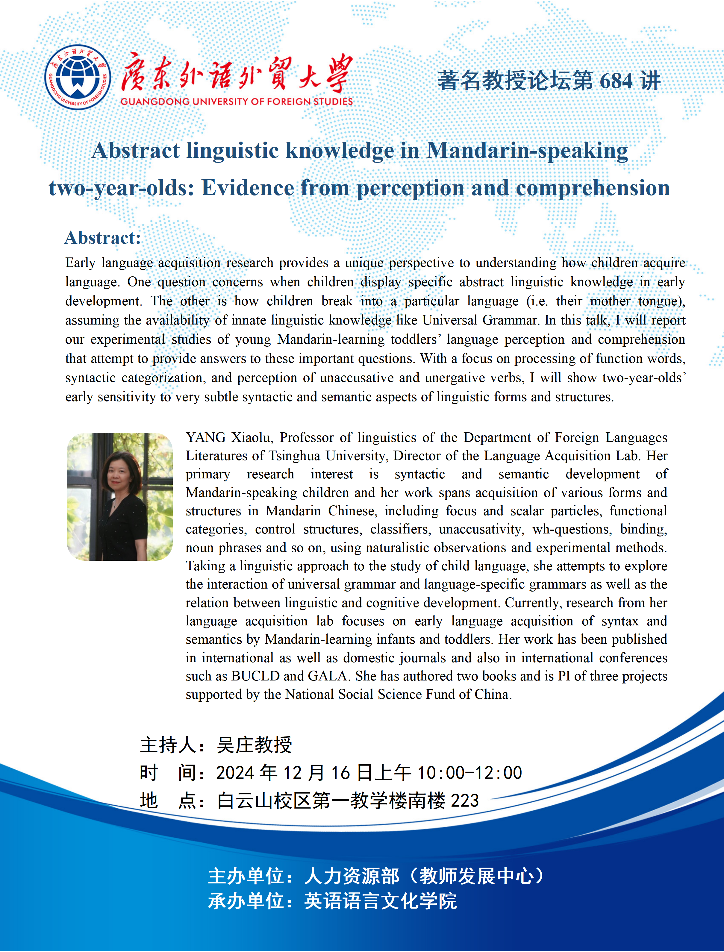 【著名教授论坛第 684 讲】Abstract linguistic knowledge in Mandarin-speaking two-year-olds: Evidence from perception and comprehension