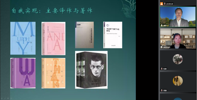曹博教授长期从事爱尔兰文学研究和翻译,也是“十二五”、“十三五”国家重点规划图书《萨缪尔·贝克特全集》、《萨缪尔·贝克特书信集》的重要译者。此次讲座,曹波教授分享了贝克特作品的汉译史,并通过译例解读,为同学们展示作为一名译者的思考和心得。