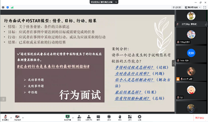 会上,四位嘉宾重点分享了求职过程中的简历制作和面试技巧。嘉宾们指出,简历应清晰明了、简洁精准,可使用数据量化等方法凸显自身优势。面试技巧根据面试前中后三个阶段有所不同:面试前应对面试公司和工作需求等有一定了解,面试时针对不同形式的面试侧重点也应有所变化,例如,在无领导小组面试中,求职者可主动扮演不同角色投身到推进问题解决的过程中,切忌与其他求职者发生言语冲突;在面谈类面试时,可提前准备好可能的问题并多加排练。同时,在行为面试中,可根据STAR模型,即情景、目标、行动和结果四个方面来推进面试流程。