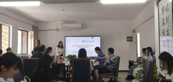 然后,杨静教授从外及里、从里及外,对《美国工厂》进行了细致探讨。一方面,从拍摄背景、制作团队、所获奖项、社会评论及影响这几个方面,她指出,借助这部纪录片,我们可以在商品、劳动力、资本和观念的全球流动中,审视“自我/他者”观念的不断变化。另一方面,从对片中中美双方的文化差异与遇到的文化冲击的剖析,杨教授探讨了“电影”“工厂”“全球化”与“现代性”之间的关系。通过举出美国通用汽车公司(General Motors)、中美工作理念、导演政治偏向、美国联合汽车工会(United Automobile Workers),中国工厂口号等丰富的例子,杨教授展现了对电影文本的细致解读,引导学生们从学术的角度理解电影,并以文化研究的视角反思电影工业,为大家带来了深刻全面的知识。她在结论中指出,这部电影纪录片展示了人们通过抵抗协商来处理身份复杂性的多种方式。同时,针对该片所作出的研究,揭示了现代性高级阶段美中交流存在隐患与潜在性。此外,电影还能够推动改变世界。最后,基于对这部电影纪录片的研究,杨静教授为在场的师生介绍了未来的潜在研究议题与方向。