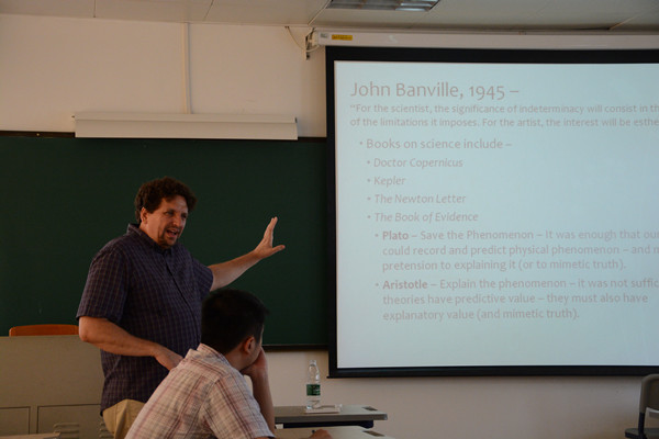 Daniel介绍的另一位后现代主义作家——托马斯﹒品钦更是将物理学、高等数学等丰富的科学理论纳入作品之中,在融合科学与文学的方面,可谓达到了极致,形成了他的作品扑朔迷离、错综复杂的鲜明特征。因此,Daniel介绍品钦的作品时着重介绍了作品所涉及的科学理论。谈到品钦的《拍卖第49组》时,Daniel认为这部作品所阐释的理论是热力学第二定律,作品本身就是一个关于熵和人类的境况的思想实验。Daniel还较为详细地介绍了热力学第二定律,及其作品中的其他特点,如作品中的幽默。此外,Daniel还简单地列举了一些现代的先进科学理论,如爱因斯坦的相对论和“薛定谔的猫”。