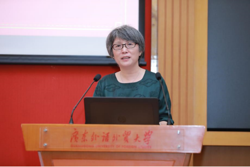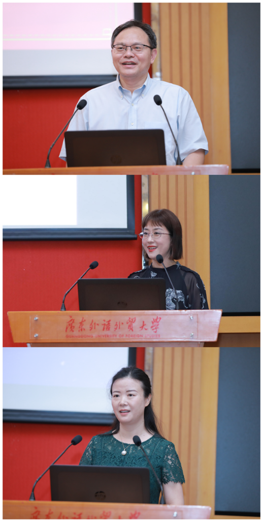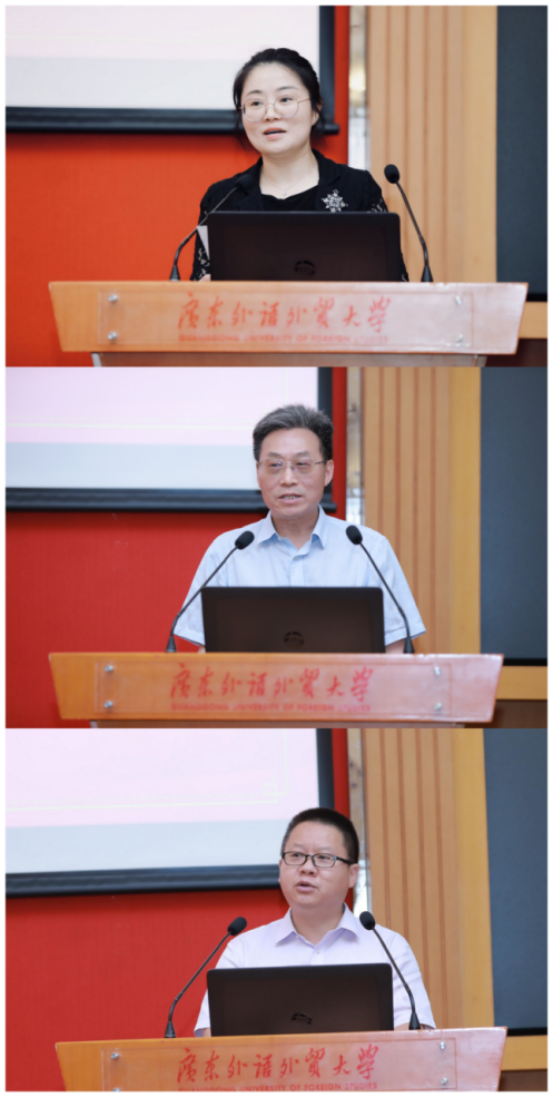 (从上到下依次)广东外语外贸大学副校长刘建达教授、广东省教育厅高等教育处处长姜琳教授、暨南大学外国语学院彭帆副教授致辞及学术报告
